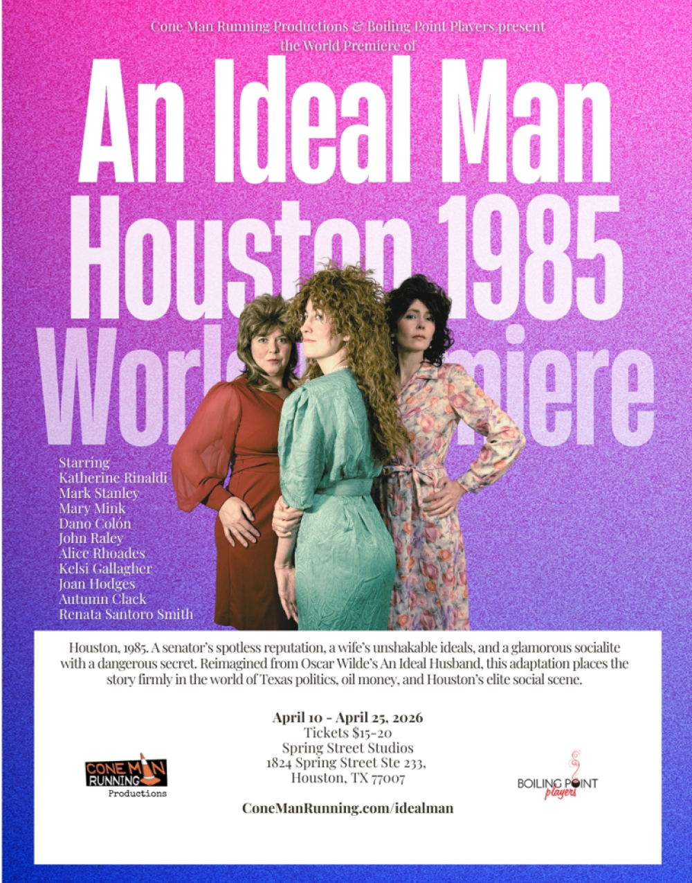 Cone Man Running Productions and Boiling Point Players have revealed the cast and creative team for An Ideal Man, a world premiere adaptation of Oscar Wilde's An Ideal Husband, set in Houston, 1985, adapted and directed by Ruth S. McCleskey. Performances will run from April 10 through April 25.