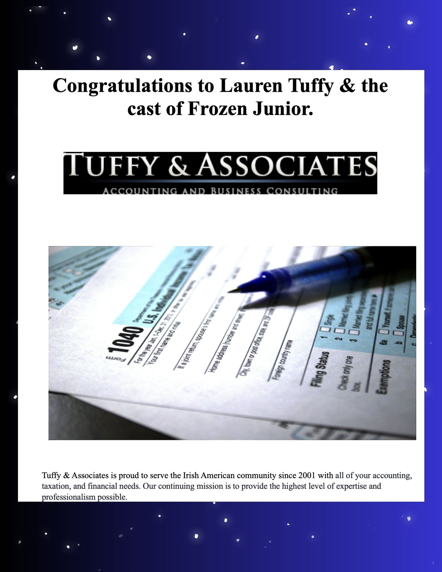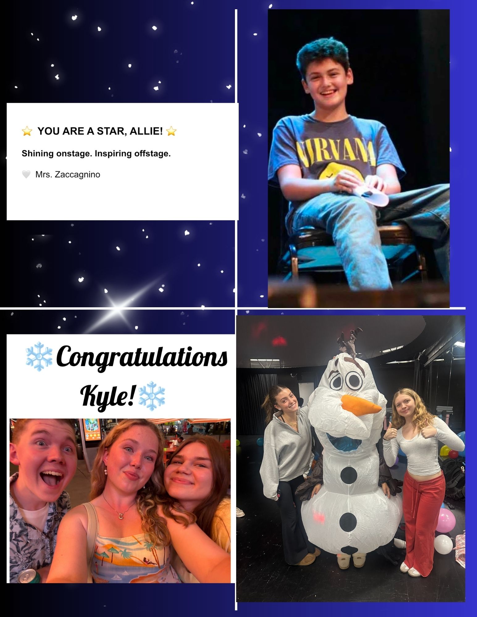 Sofia is thrilled to return to musical theater with the Iona Prep Players. Frozen Jr. has been an exciting experience, and she’s loved the chance to step back on stage. In addition to acting, Sofia is on her HS basketball team, plays volleyball, is a Taekwondo Black Belt and in her free time, loves spending time with her family. She extends her heartfelt thanks to everyone who helped make this experience possible!