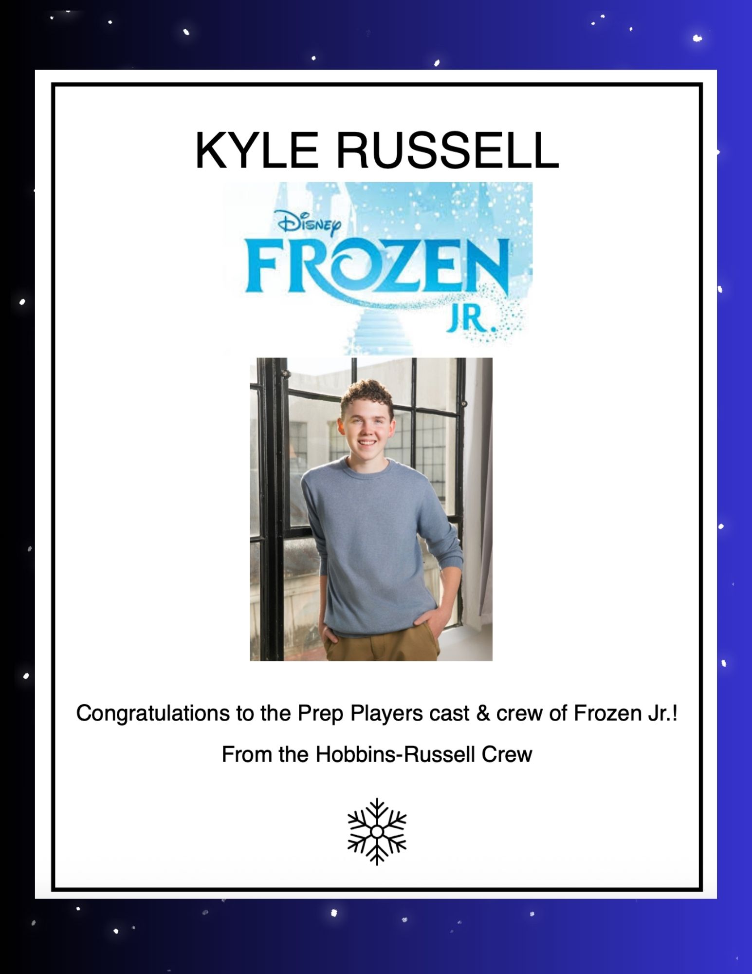 Brady is a sophomore at Iona Prepratory school and has been a part of the Prep Players since last year. Frozen is his 3rd performance at Iona. His previous roles include Michael Hobbs in Elf, and Pepper in Mamma Mia! Brady would like to thank the entire cast and crew, along with Jordan, Halle, Jess, and Tommy for such a great show. Brady would also like to thank his various uber eats drivers for always delivering his food during rehearsals.