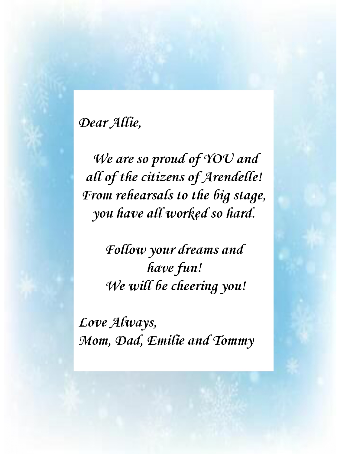 Allie is so excited to be participating in Frozen. She has previously performed in Mamma Mia!, Mean Girls & Elf the Musical at Iona and engages in numerous dance competitions every year. Allie would like to thank the cast of Mamma Mia for creating such a welcoming and fun environment!