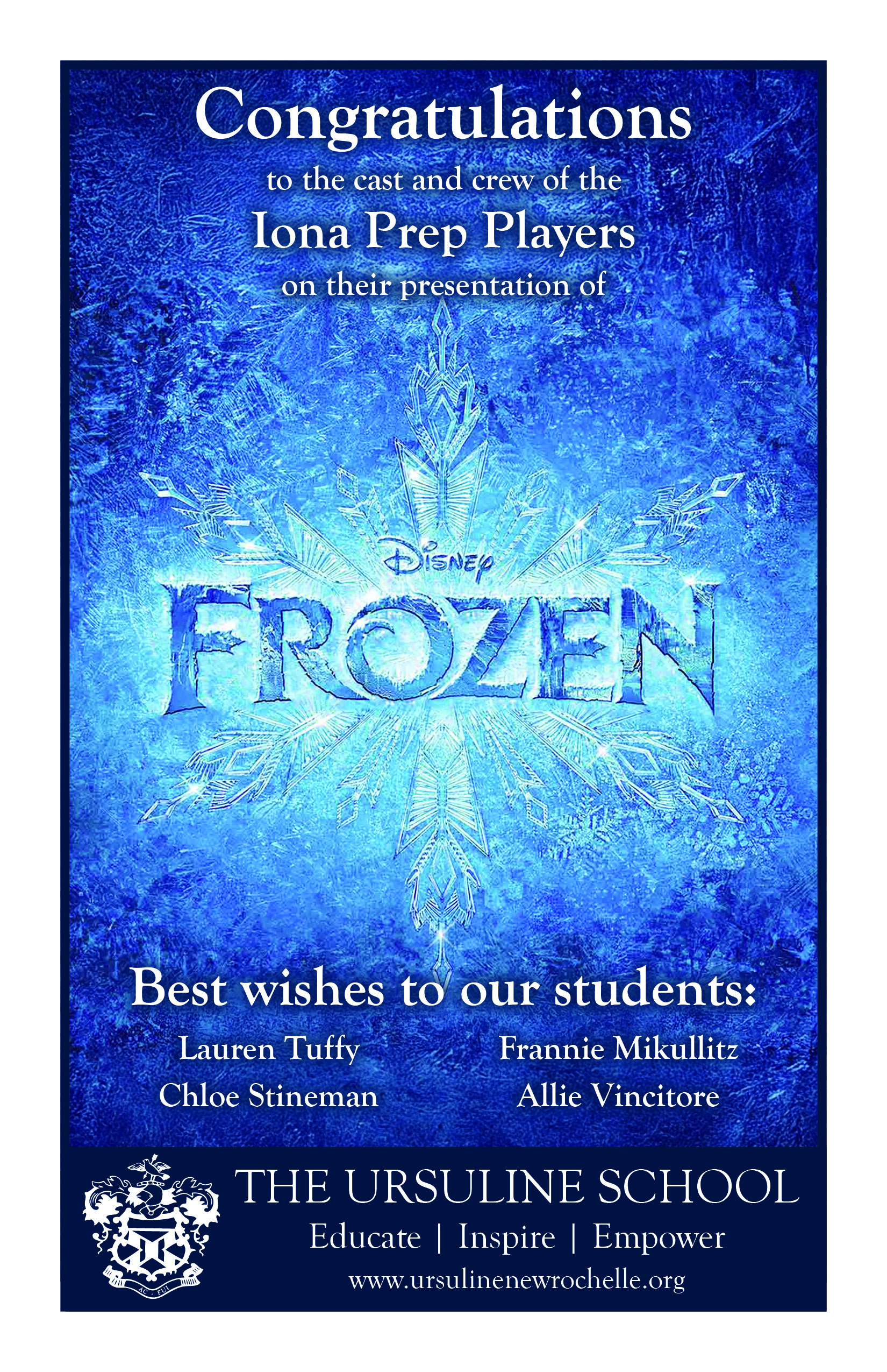 Frances (Frannie) Mikullitz is a 9th grade student at The Ursuline School. This is Frannie['s first production with the Iona Prep Players. She is so excited to be a part of Frozen JR and would like to thank the entire cast and crew for making her first show here such an amazing experience.