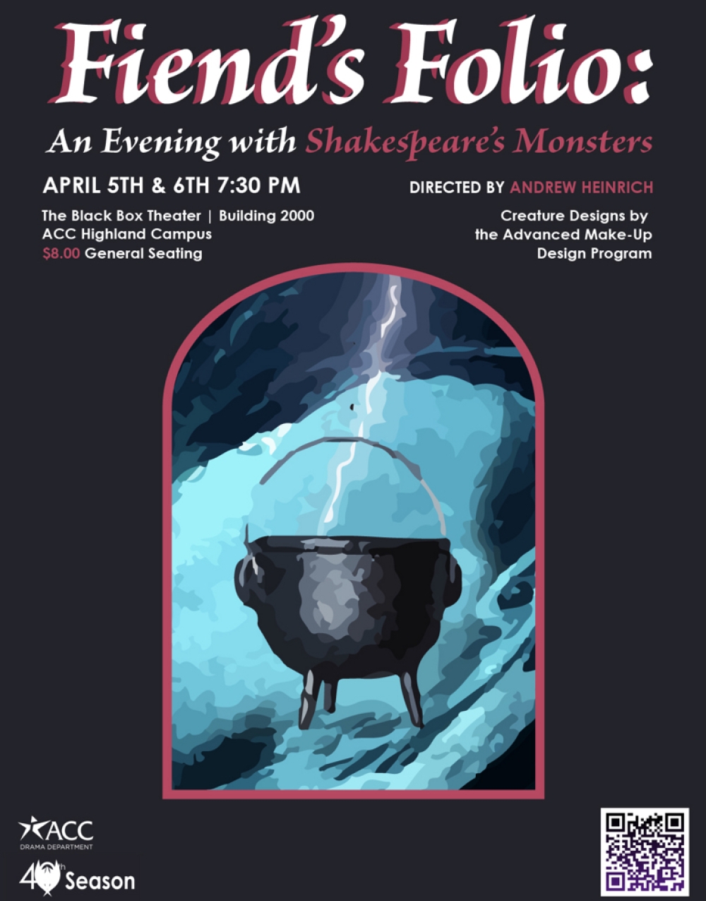 Samuel Coldiorn Is a student within the Drama Department At ACC. The Fiends Folio production is his first show doing costuming and makeup artistry for, which include scenes from The Tempest and MacBeth. He is a native Austinite, who is very excited to be working on production in his hometown.