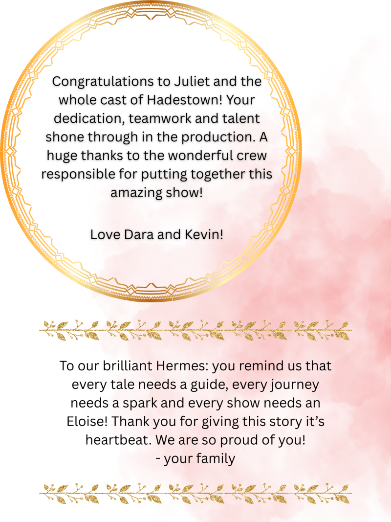 As stories pass through time, we reflect, learn, and tell them again. Hadestown is honest with us: the ending won’t always be happy. But even in its darkest moments, it sparks a flame of hope—a reminder that in tragedy there is still beauty, resilience, and the call to keep trying.