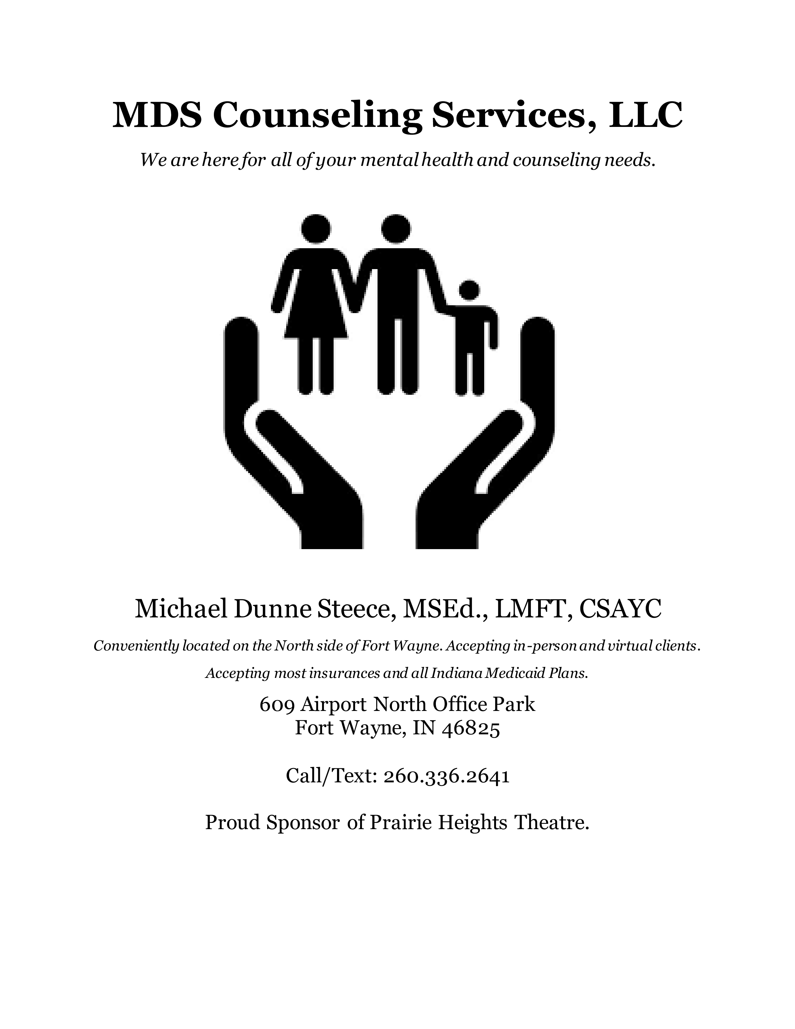 Mya is the daughter of Casey and Dusty Wilhelm. Mya has been involved in theatre since third grade, and this will be her 22nd production. Some of her favorite roles include ensemble in “Mamma Mia!” and backstage in “A Night Under the Stars.” Mya is attending Huntington University next fall to major in nursing, and plans to become a nurse practitioner.
