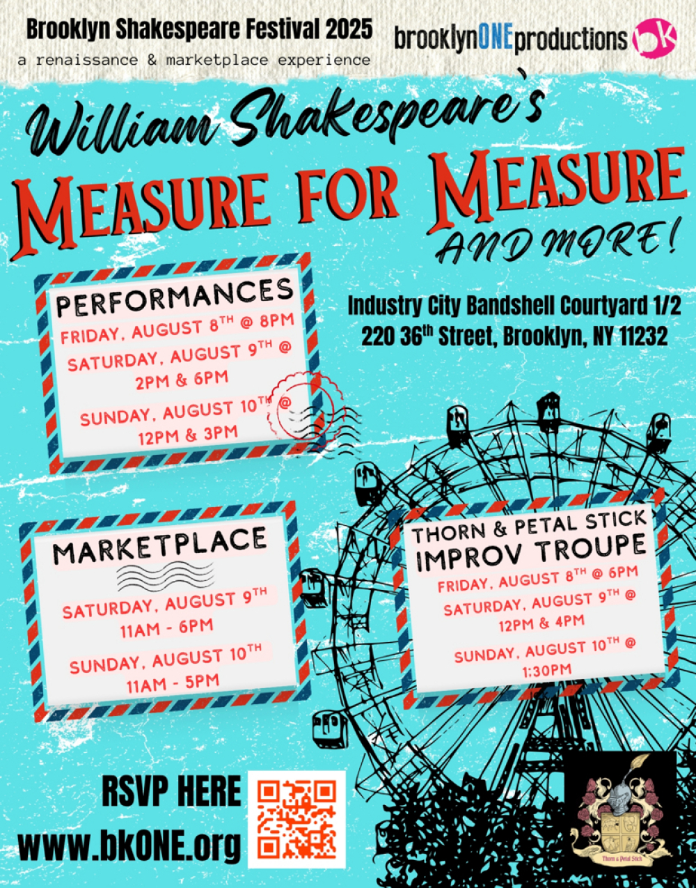 This summer, brooklynONE productions (bkONE) invites audiences to step into a whirlwind of Shakespearean revelry, local artisan culture, and spontaneous performance at the Brooklyn Shakespeare Festival 2025, held August 8–10 in the scenic Bandshell Courtyard 1/2 of Industry City (220 36th Street, Brooklyn, NY).